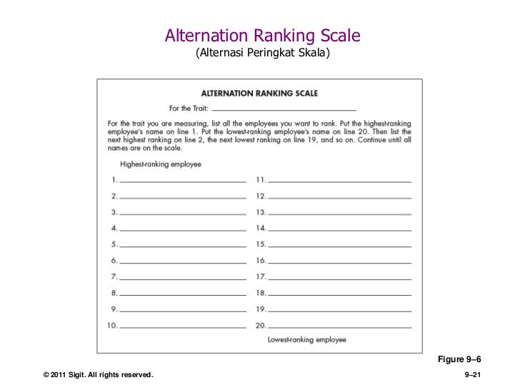 Metode Peringkat Alternasi (Alternation Ranking Method), dilakukan dengan cara membuat peringkat karyawan dari yang terbaik sampai yang terburuk pada satu atau banyak ciriView Kore Ludji, Jimmy Reinheard_Assignment Chapter 9docx from MANAGEMENT MISC at Klabat University Nama Kore Ludji, Jimmy Reinheard Paralel B Human Resources Management (ChapterKarena biasanya lebih mudah untuk membedakan antara karyawan yang terburuk dan yang terbaik, metode peringkat alternasi (alternation ranking method) adalah yang paling populer Pertama, data semua subordinat yang akan diberi ranking, dan kemudian keluarkan nama yang tidak cukup banyak diketahui untuk diberi ranking Kemudian di dalam form seperti Gambar 94, indikasi